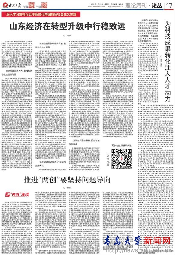新聞網訊 1月25日,《大眾日報》理論版刊發我校黨委書記胡金焱理論文章“山東經濟在轉型升級中行穩致遠”。