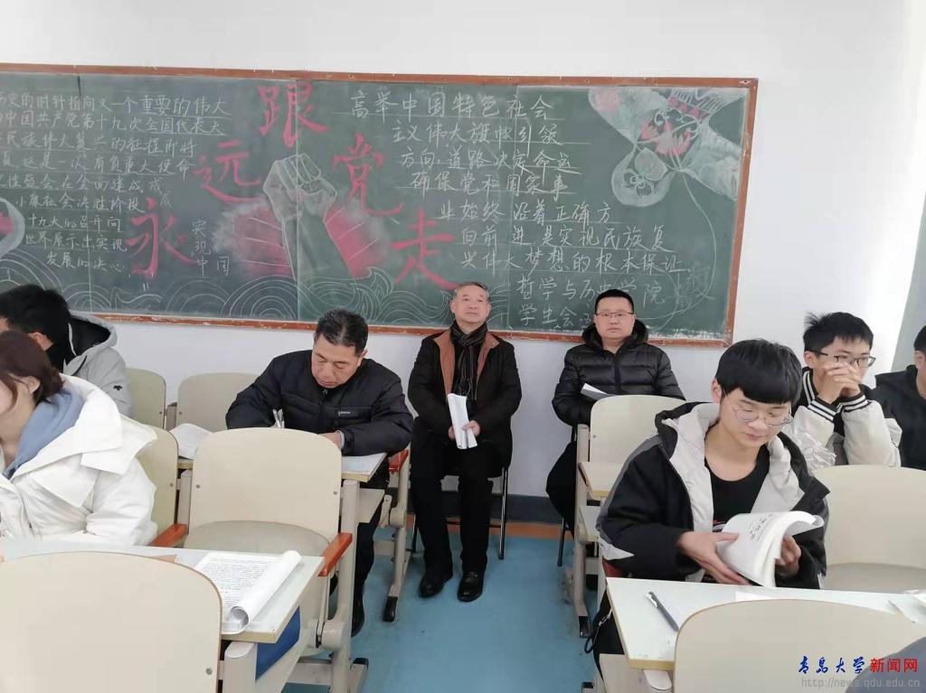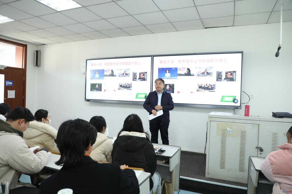 在課間休息時間,胡金焱與任課老師和同學們親切交流。他充分肯定了近年來學校思政教育取得的成果和進步,并指出“青大思政大課堂”不僅是一個品牌,更是一種教育情懷、育人情懷。以劉正剛教授為總負責人的團隊,傾注熱忱與情感,充分發揮創新精神和勤勞智慧,引入豐富教學成果和“社會課堂”資源,打造了思政教育的青大樣板,形成了可復制可借鑒的亮點品牌。胡金焱對“思政大課堂”建設提出兩點建議:一是深入學習習近平總書記對思政課建設的改革創新方法論,以“八個相統一”為指引提高思政課教學質量;二是厚實青大“六大思政”,推進教師思政、課程思政、專業思政、隊伍思政、文化思政、學生思政一體化閉環建設,助力推動形成“一二三四五”協同育人格局。最后他鼓勵同學們抓住“青大思政大課堂”的學習機會,把思政作業寫在祖國大地上。