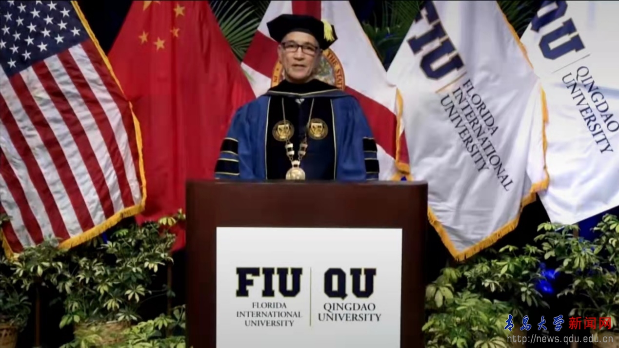夏東偉在致辭中首先向圓滿完成學業(yè)的畢業(yè)生們表示祝賀,并向付出了辛勤勞動的兩校教職員工和關(guān)心支持青島大學的社會各界朋友表示衷心感謝。他介紹了青島大學的辦學特色和所得成就,以及與佛羅里達國際大學聯(lián)合舉辦西班牙語專業(yè)(拉美貿(mào)易方向)本科雙學位教育項目的合作辦學歷史。并對本屆畢業(yè)生寄予了殷切的期望:第一,堅守與時代同脈的高遠理想,心系民族命運,關(guān)注國家大事,在實現(xiàn)民族復興的宏偉事業(yè)中奉獻自己的青春年華;第二,厚植與時代同行的家國情懷,注重修身齊家,強化責任擔當,在實現(xiàn)新時代的夢想中譜寫無悔的青春之歌;第三,練就與時代同進的過硬本領(lǐng),變革思維方式,提升能力本領(lǐng),在實現(xiàn)青春夢想中展示絢麗多彩的人生才華;第四,成為世界文化交流的推動者,發(fā)揮專業(yè)所長,為建設人類命運共同體的偉大夢想貢獻自己的力量。最后,夏東偉校長祝愿每一個畢業(yè)生都能勇往直前,鵬程萬里,不辜負這個偉大的新時代,也祝愿兩校友誼天長地久,合作再結(jié)碩果。
