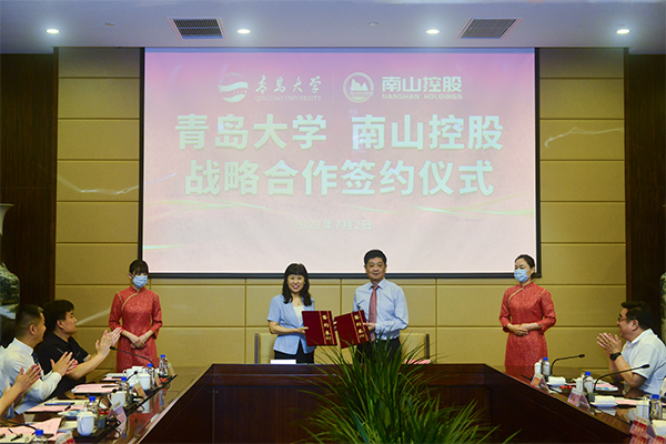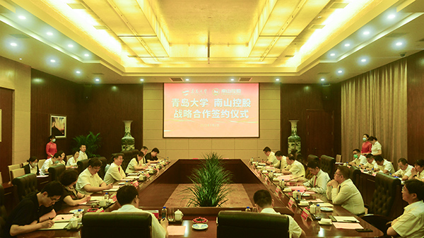 南山控股董事長在講話中肯定了青島大學近年來快速發展取得的成績。他表示,希望與青島大學開展產學研用、人才培養等方面的深度合作,帶動、助力南山控股邁向高質量發展新征程。期待青島大學和南山控股在多個產業領域全方位深化合作,開拓優勢互補、資源共享的合作新局面,實現南山教育、南山產業和青島大學的共贏發展。