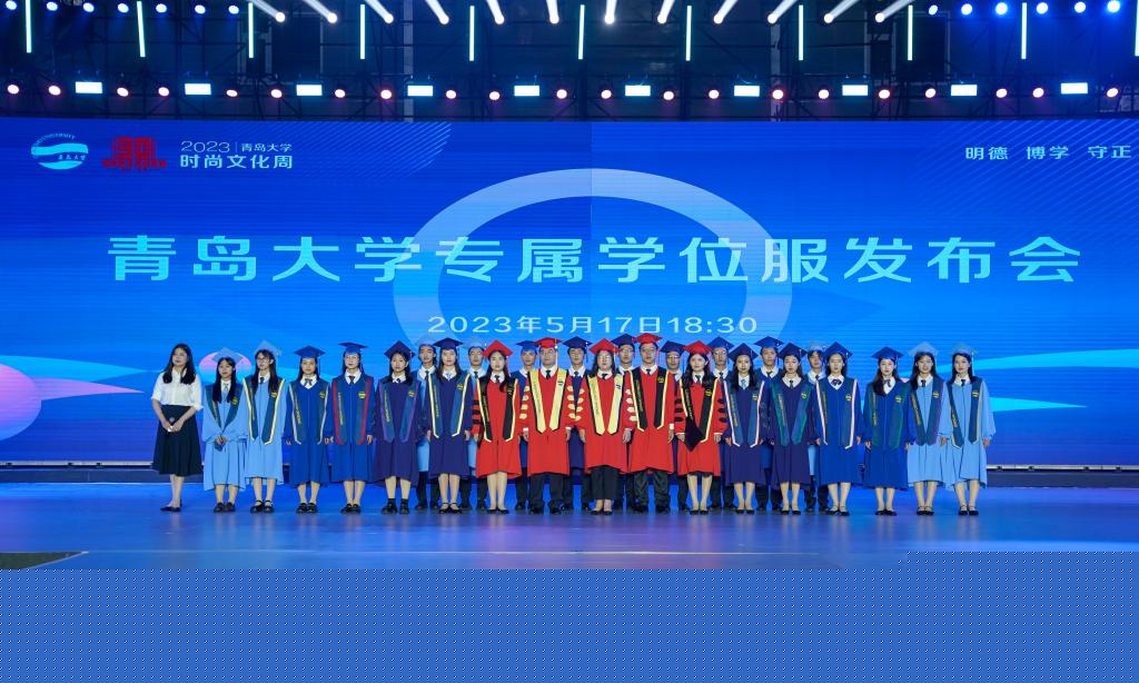 據悉,學位袍主色選擇了青島大學的標志色“青大藍色”及“青大紅”。學生學位袍的設計取自于海洋色彩,隨著學位層次的提高藍色由淺及深,寓意學術研究精進深入。導師及校長服的袍身主色采用“青大紅”,寓意師德如半天朱霞,凸顯威嚴與莊重。右側繡有青島大學的標準英文字體,左側繡有校徽。學位帽裝飾以青島大學的英文簡稱QU的金色金屬掛飾,可拆卸作為畢業生的留念。此外,還設計了青島大學學位服周邊產品,例如領帶、襪子等。