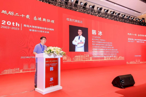 03級校友代表、青島大學附屬醫院副主任藥師韓冰代表青島大學藥學院全體校友,向辛勤付出、孜孜不倦、傳道受業的老師們表示衷心的感謝。青大校訓“明德、博學、守正、出奇”已逐漸凝聚為青大藥學人的精神傳承。