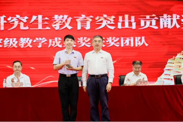 校黨委書記胡金焱為國家級教學成果獎獲獎團隊頒發青島大學學位與研究生教育突出貢獻獎,團隊代表自動化學院趙林教授上臺領獎。