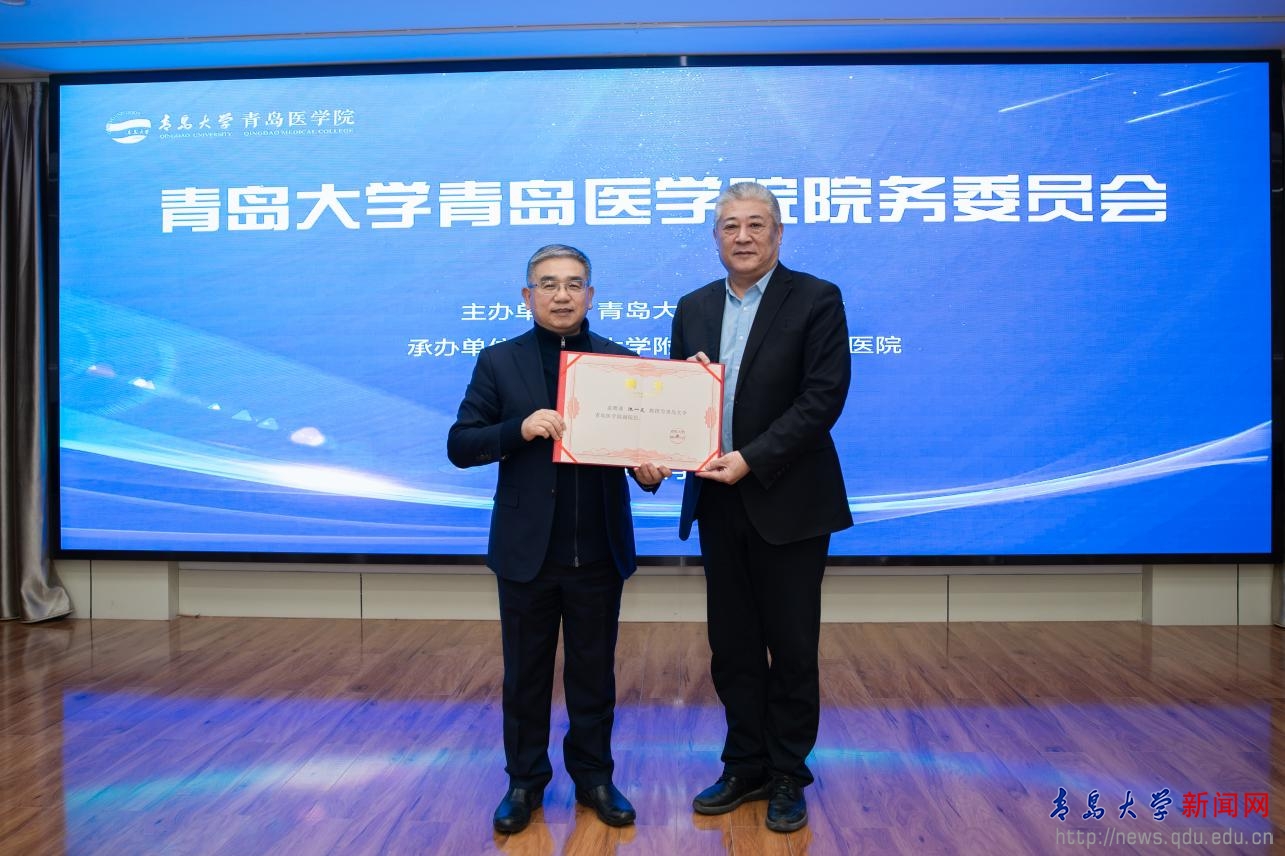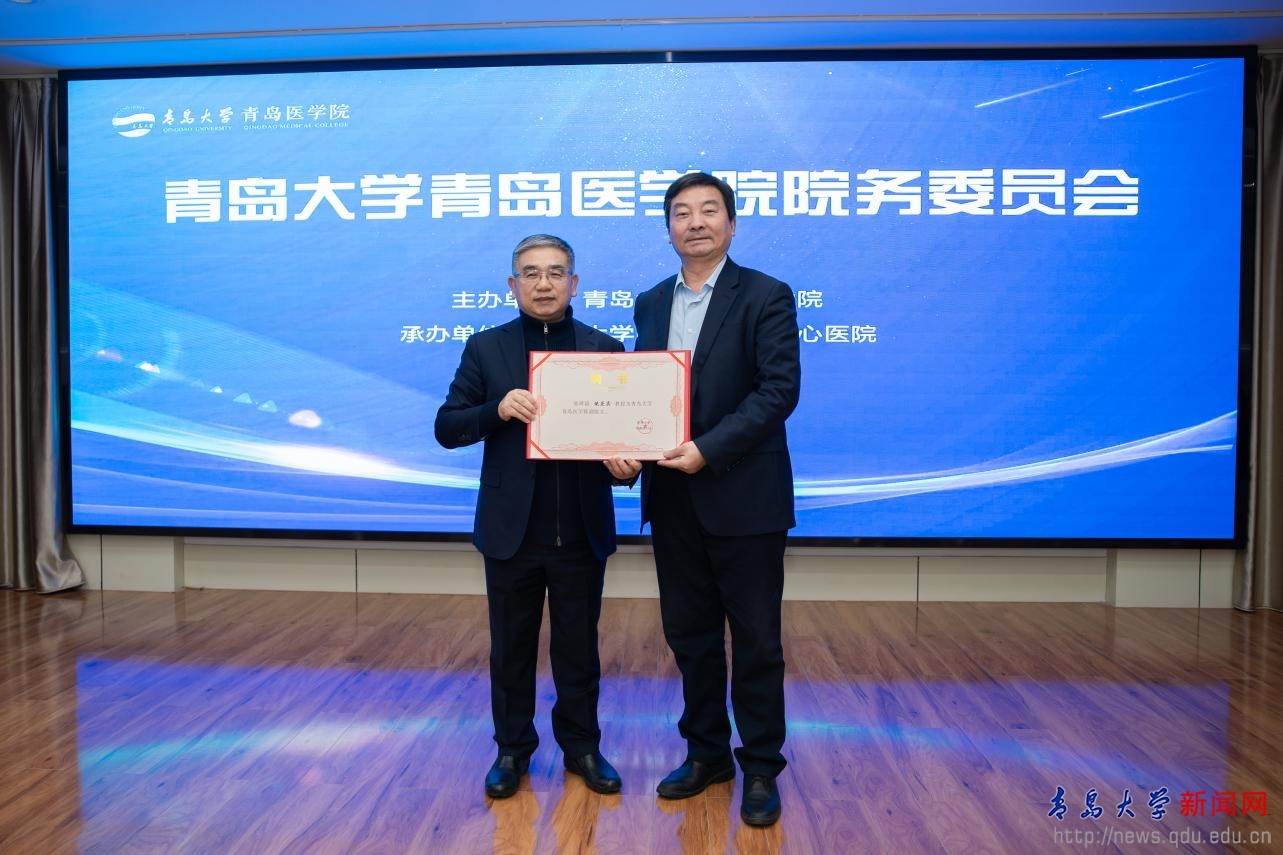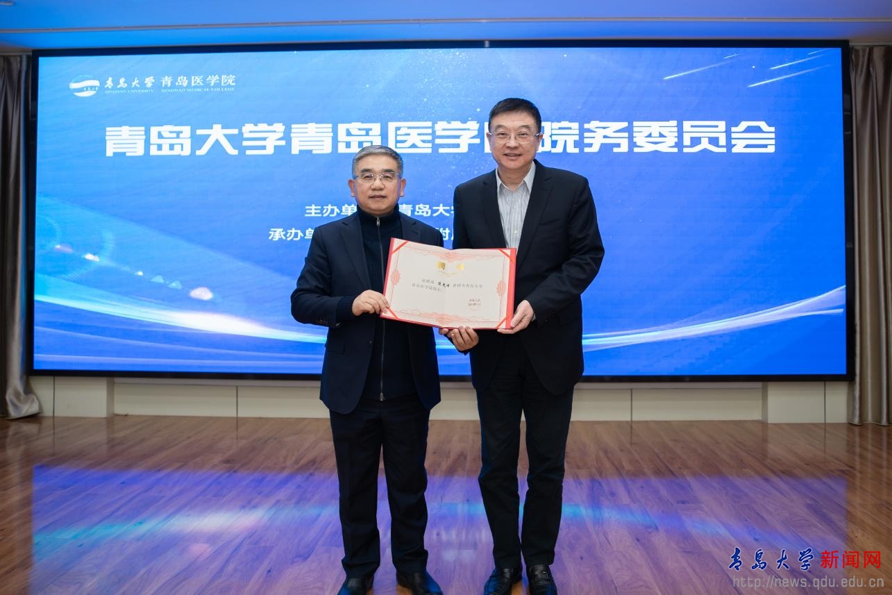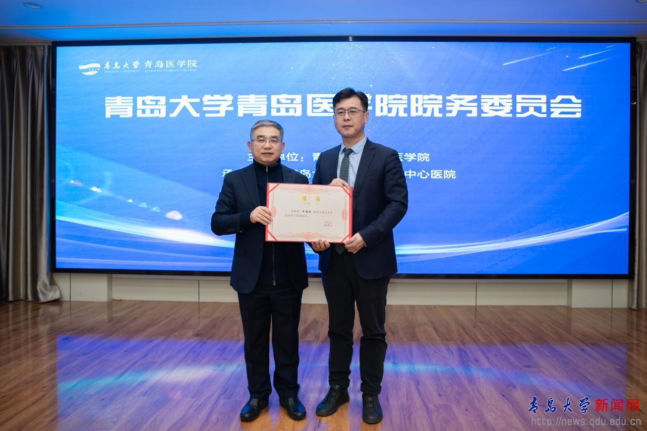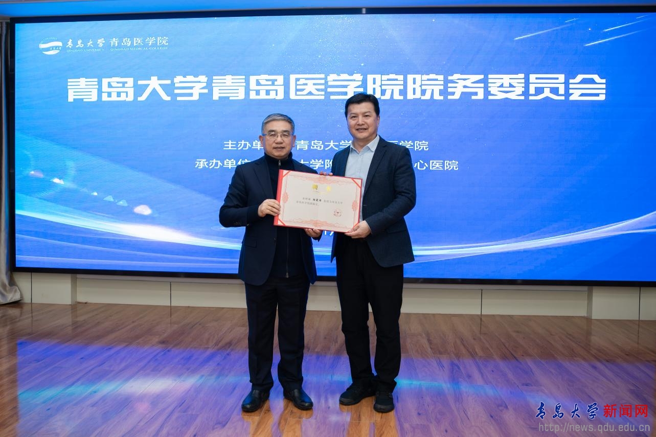 會前,李榮貴宣讀《關于調整青島大學青島醫學院院長、副院長聘任及院務委員會的通知》。胡金焱為新任院長、副院長頒發聘書。
