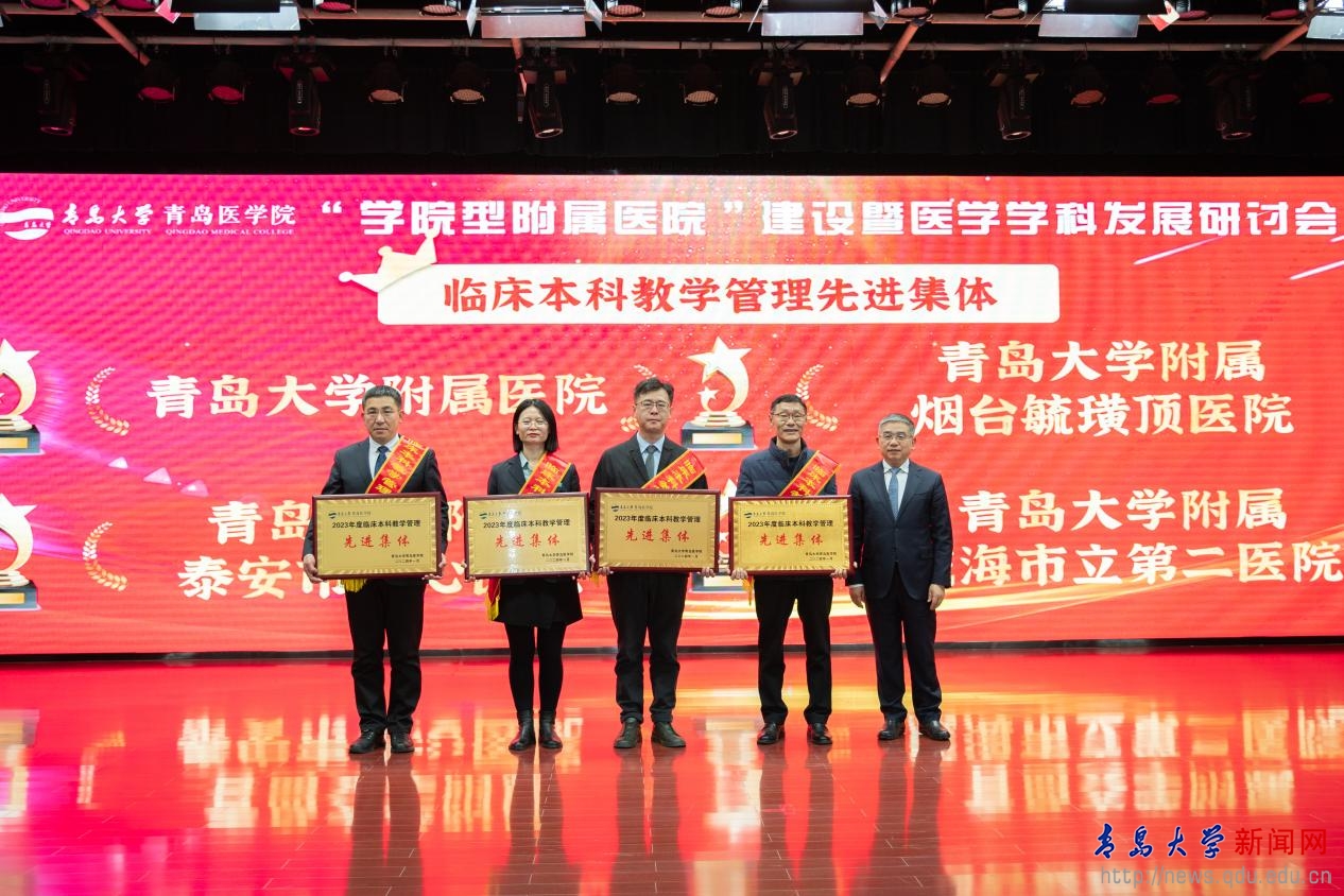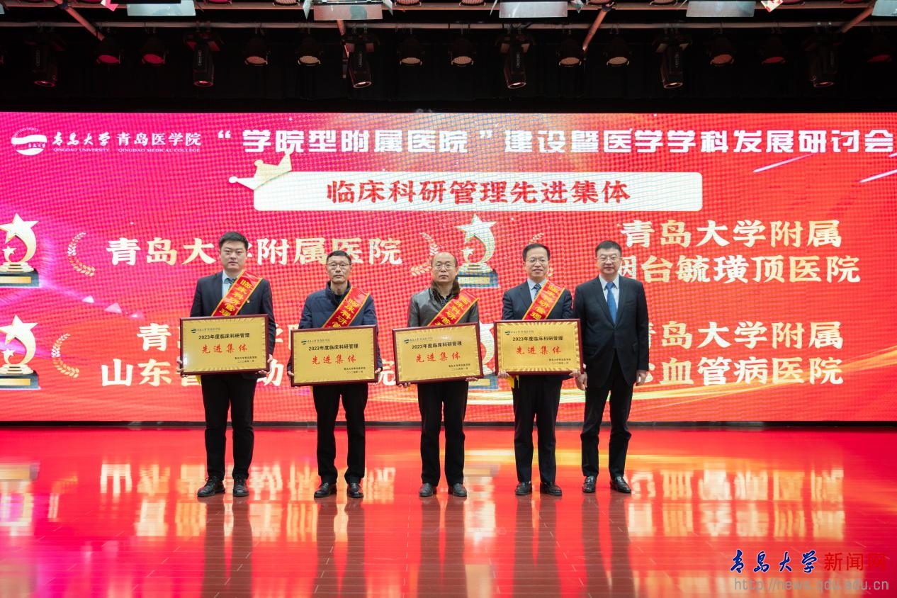 醫學部黨委書記、青島醫學院院長蔣光峰宣讀附屬醫院表彰決定。隨后舉行了隆重的頒獎儀式,為在2023年科教工作表現突出的各附屬醫院有關集體和個人頒獎。