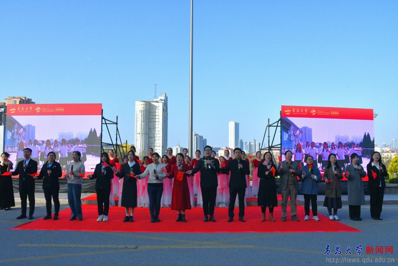 儀式在雄壯的《義勇軍進行曲》中拉開序幕,五星紅旗在國旗班護衛下,在全體師生嘹亮的國歌聲中冉冉升起。隨后,外語學院2023級退役學生張穎進行主題演講,她結合自己的軍旅生涯,在國旗下發出“請放心吧,祖國”的錚錚誓言;2022級李文靖等同學帶來情景朗誦《81192 請返航!》,深切緬懷王偉烈士熱血灑海疆、忠魂護國門的英雄事跡。最后,卞建華與外語學院師生代表用多國語言合唱《我和我的祖國》,共同唱響對祖國的深情與熱愛。