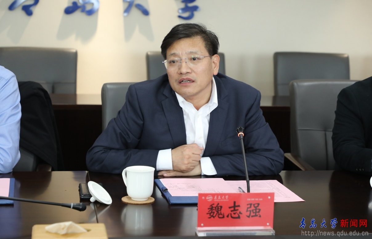 魏志強代表學校對卞建平一行的到來表示熱烈歡迎,對青島政協聯誼會對學校事業發展給予的支持表示感謝,并介紹了學校學科發展的戰略布局和優勢特色。他表示,近年來學校發揮“醫工交叉、特色鮮明,文理支撐、綜合厚重”的辦學治校優勢,著力推進醫學、紡織、人工智能等學科集群的交叉融合發展,構建起醫工交叉體系的“四梁八柱”。今后,學校將圍繞國家戰略需求,聚焦生命健康、食品藥品安全等領域,深化校地協作,推動生物醫藥、醫療器械、海藻纖維新材料等產業科技創新與成果轉化,為服務國家和區域經濟社會高質量發展貢獻力量。