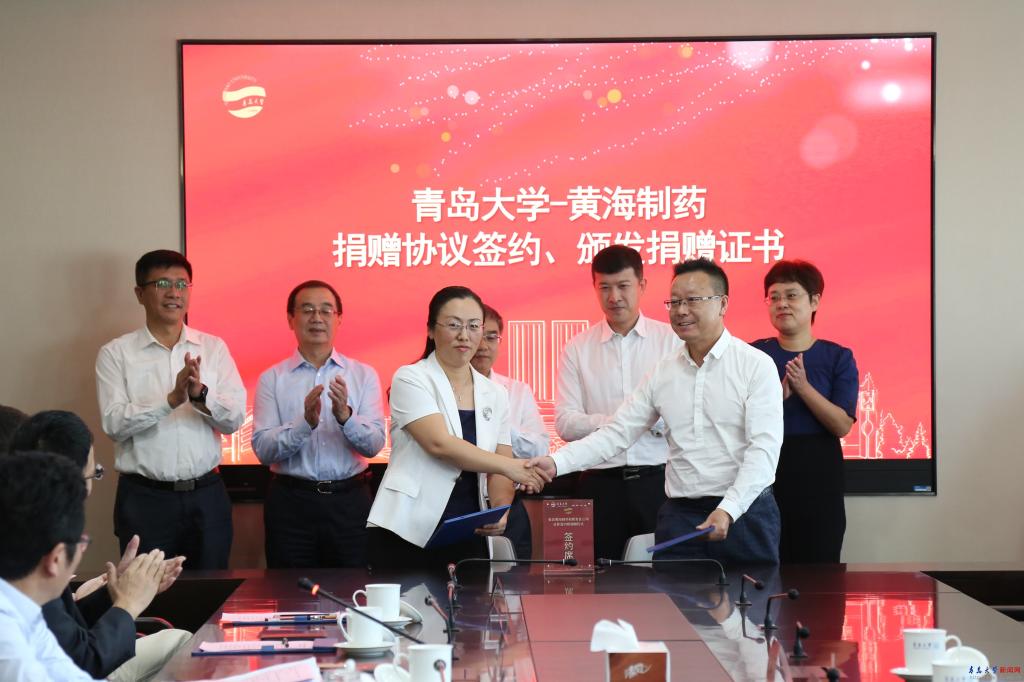 新聞網訊 9月30日上午,青島大學與青島黃海制藥有限責任公司合作簽約暨捐贈儀式在我校舉行。黨委書記胡金焱,黨委常委、副校長于紅波,原校領導邵彬,青島黃海集團董事會主席王澤楷、青島大學86級優秀校友、青島黃海制藥有限責任公司董事長張海英、青島黃海制藥有限責任公司總裁兼黃海醫院投資有限公司總經理劉鳳杰,青島華賽伯曼醫學細胞生物有限公司董事長兼總經理高青,青島萬明賽伯藥業有限公司董事長張萬明等出席儀式。