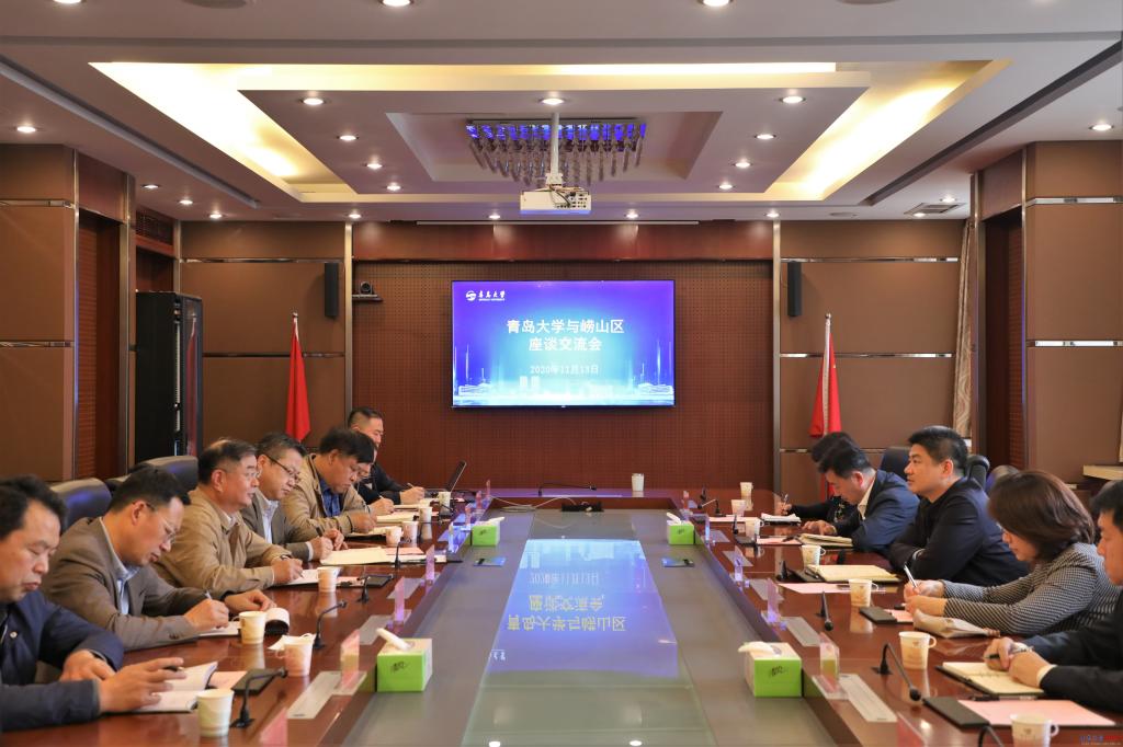 嶗山區副區長張詠雁、政府辦公室主任高正佳、教育和體育局局長姜學環,財政局、科創委相關負責人和我校黨委辦公室、校長辦公室、科技處、財務處、合作發展處、科技成果轉化中心、教育集團主要負責人參加了座談交流。