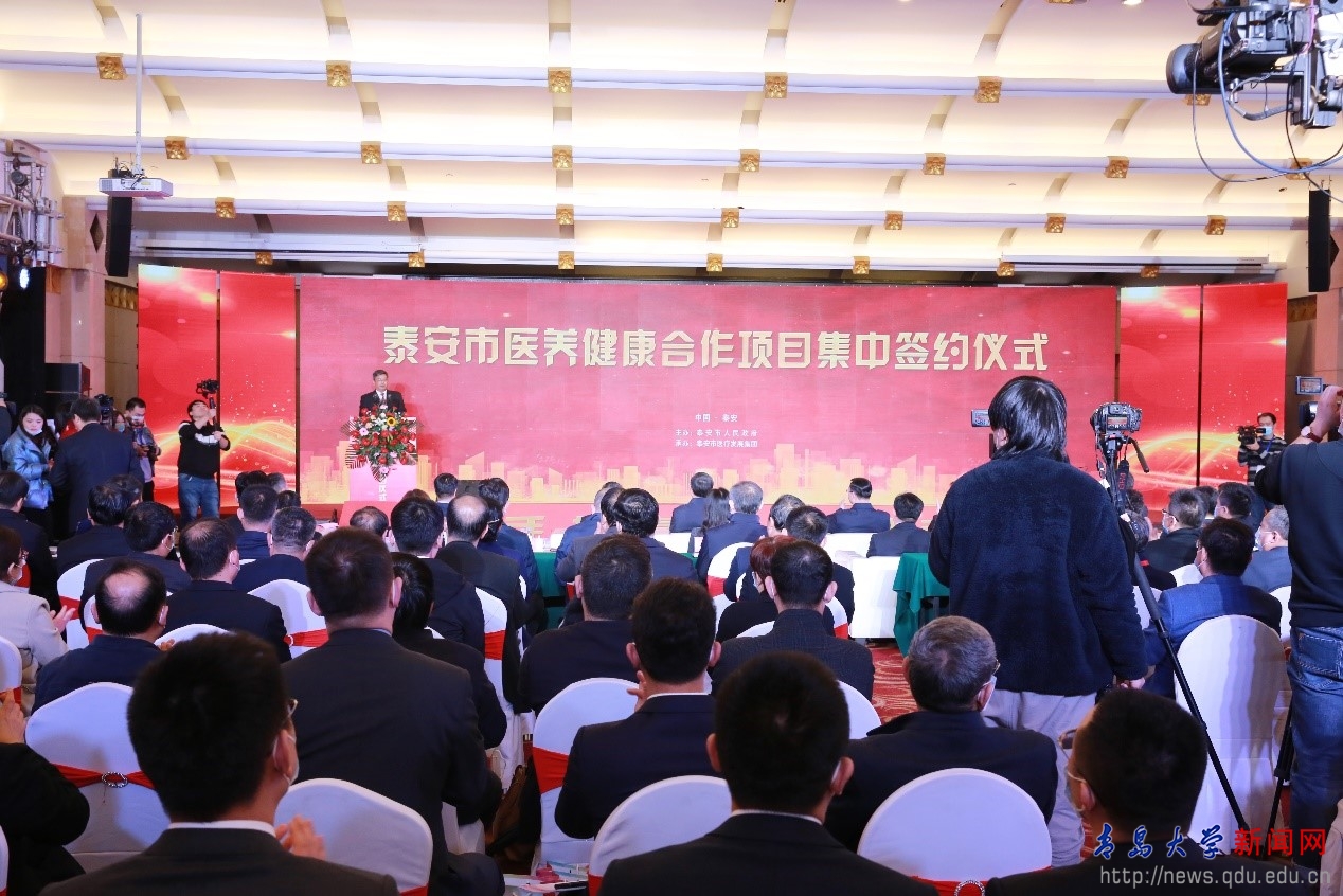 新聞網訊 11月21日上午,我校與泰安市人民政府在泰安市醫養健康合作項目集中簽約暨醫療發展集團揭牌儀式上,簽署共建“青島大學泰安醫學中心”戰略合作協議,并將泰安市中心醫院納入直屬附屬醫院管理體系,青島大學附屬泰安市中心醫院正式揭牌。