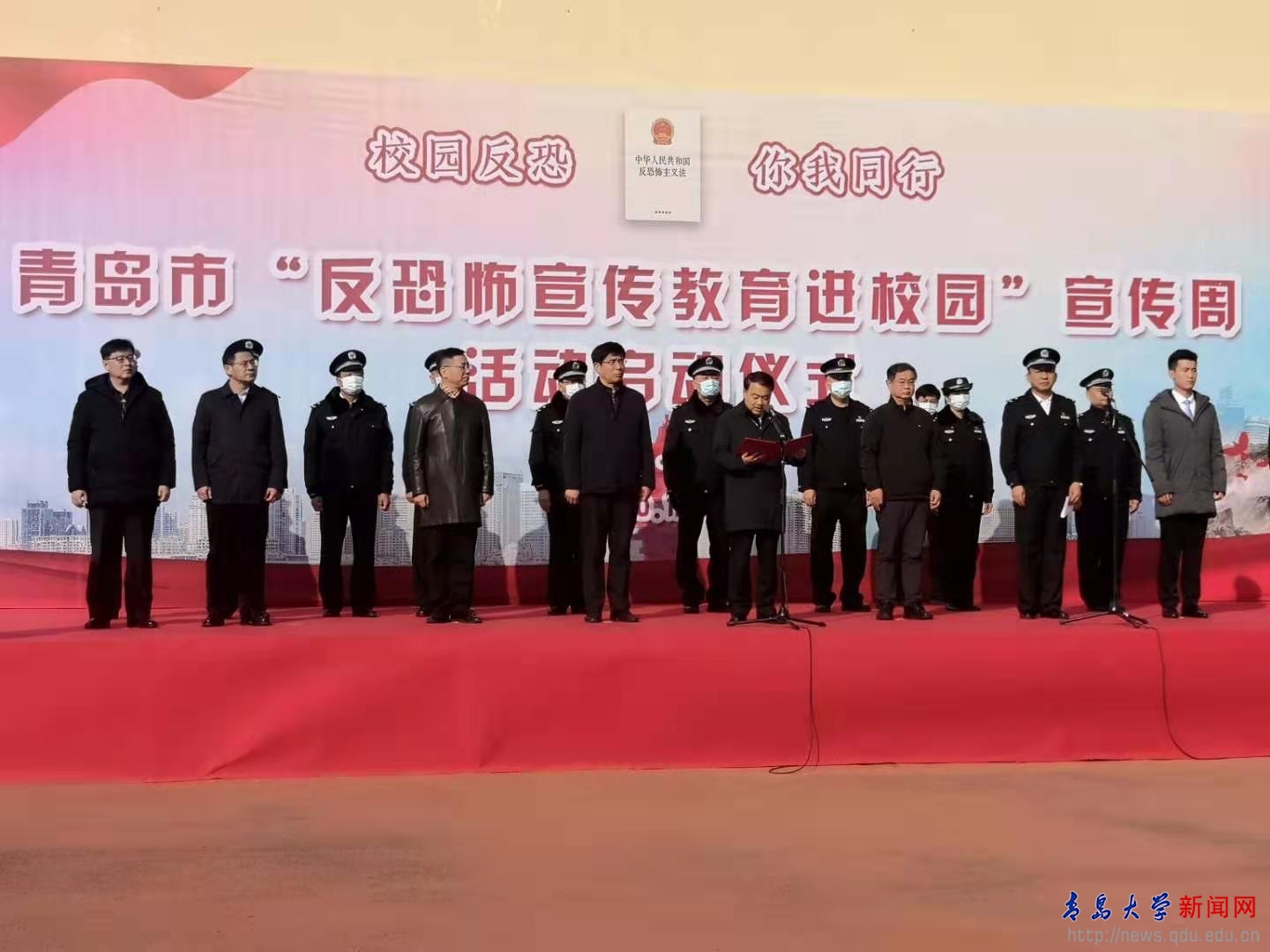 新聞網訊12月27日,青島市“反恐怖宣傳教育進校園”宣傳周啟動儀式在我校舉行。青島市副市長、市公安局局長隋汝文、我校校長夏東偉,以及市委政法委、市委高校工委、各區市公安局、教育局相關領導和部分駐青高校師生近300人參加了活動。