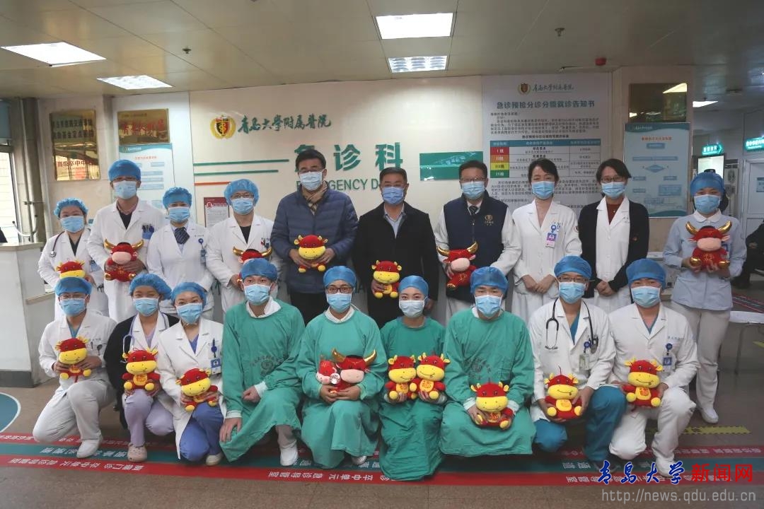 下午,夏東偉校長在青島大學附屬醫院黨委書記王新生、院長董蒨陪同下,先后來到青大附院市南院區急診科、發熱門診、小兒外科、呼吸與危重癥醫學科、產科、重癥醫學科、胸外科、肝膽胰外科、胃腸外科、急診外科、心血管外科、手術室看望慰問了除夕仍堅守在醫療一線的醫護人員,夏東偉向醫護人員致謝,感謝他們舍小家顧大家,不辭辛苦,恪盡職守、無私奉獻。夏東偉向醫護人員送上歡樂吉祥的牛年紀念玩偶并叮囑大家保重身體,注意休息。