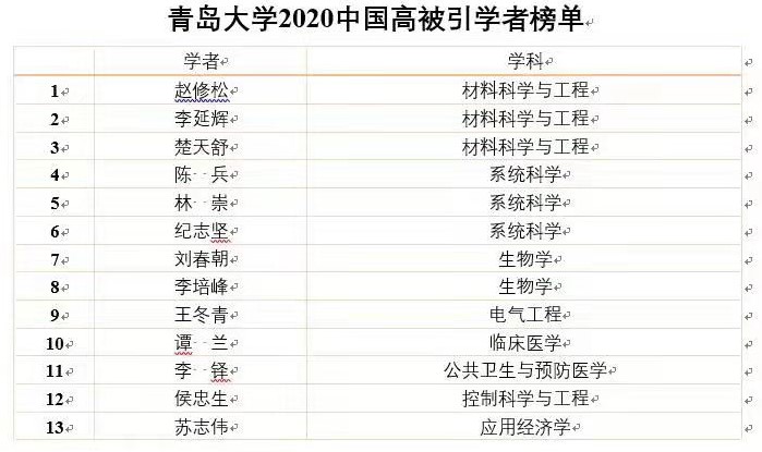 2020年中國高被引學者來自373所高校、企業和科研機構,中國科學院擁有最多的高被引學者,共441位。高校中,共296所大學有學者入選。其中,我校共有13位學者入選,位列全國高校第66位,山東省高校第2位。