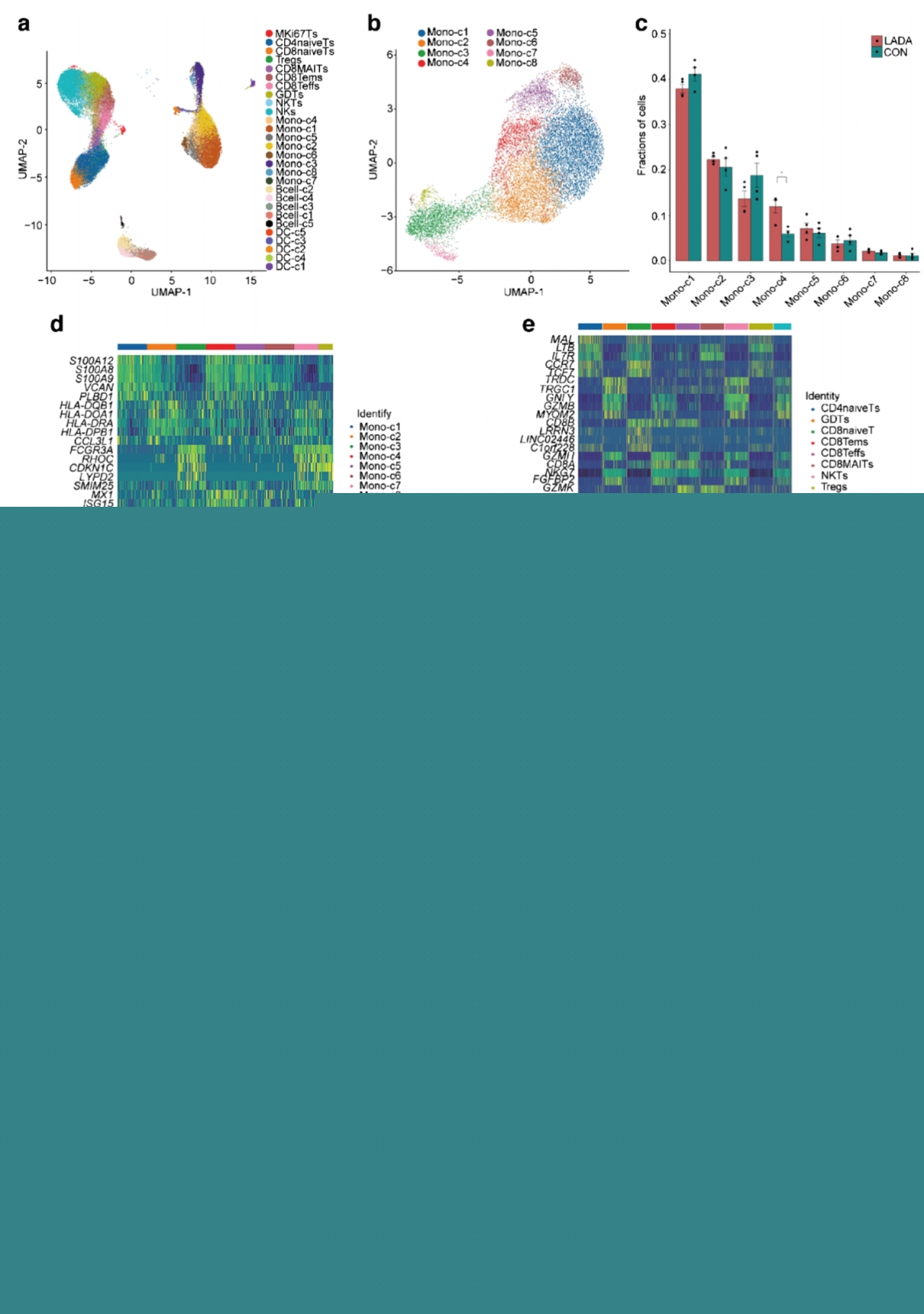 為確定LADA患者的免疫學特征,使用scRNA-seq對4名LADA供體和4名健康供體的PBMC樣本進行了測序。通過分析確定了主要細胞群,包括T細胞、NK細胞、B細胞、漿細胞、單核細胞、樹突狀細胞。通過亞群細分將單核細胞分為8個簇,其中簇1/2/4/5/6為經典單核細胞(表達CD14和VCAN),簇3/7/8為中間/非經典單核細胞(表達FCGR3A,編碼CD16);T細胞分為CD4naiveT、CD8naiveT、Treg、CD8Tem、CD8Teff、CD8MAIT、GDT、MKi67T和NKT亞群;B細胞簇1/3為naiveB細胞、簇2/4為記憶B細胞、簇5為漿細胞;樹突狀細胞簇1/4為pDC、簇2/3為cDC2、簇5為cDC1。與健康供者相比,LADA供者單核細胞中簇4的比例顯著增加(11.93% vs 5.93%,P=0.017)。