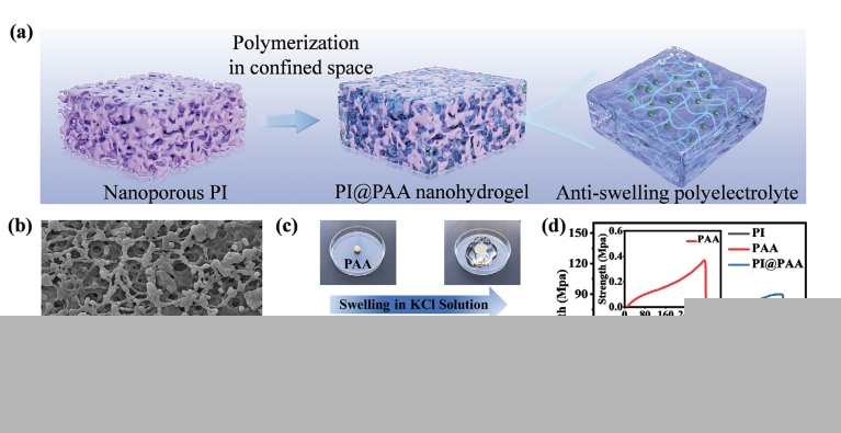 為了最大限度地發揮水凝膠的優勢,同時克服其局限性,我們首次開發了一種在納米多孔聚酰亞胺膜內原位聚合的抗膨脹3D納米水凝膠。這種創新的復合結構具有出色的抗膨脹能力,膨脹率從純水凝膠的593.2%降至37.5%,且尺寸沒有明顯變化。膜的機械強度達到89.5 MPa,比純水凝膠的機械強度提高了2個數量級。值得注意的是,抗膨脹的3D納米水凝膠還表現出優異的滲透能量轉換性能,產生高達48.5 W/m2的功率密度,本文為解決滲透能量轉換中膜的溶脹效應提供了新思路。