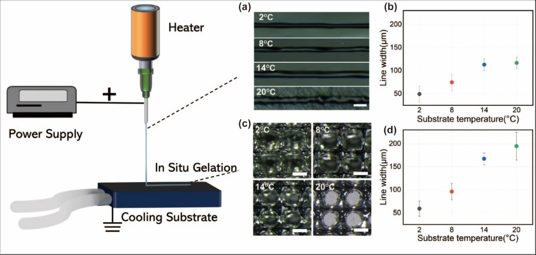 生物材料的空間結(jié)構(gòu)直接影響其植入人體組織后的功效或成敗。因此,實(shí)現(xiàn)精度高、生物相容性好的打印技術(shù)成為新一代生物材料創(chuàng)制領(lǐng)域的重要焦點(diǎn)。針對常用擠壓式打印和鑄造等技術(shù)分辨率低、復(fù)雜生物材料結(jié)構(gòu)打印難的挑戰(zhàn),腫瘤院醫(yī)工團(tuán)隊(duì)創(chuàng)造性地將溶膠-凝膠相變原理與電流體動(dòng)力(EHD)打印技術(shù)有機(jī)融合,同時(shí)完成"液態(tài)沉積-基底瞬態(tài)凝膠化"技術(shù)的突破,最終成功構(gòu)建新型“溶膠-凝膠電動(dòng)力直寫打印技術(shù)”(Sol-Gel Electrohydrodynamic Direct Writing, SGEHD)。