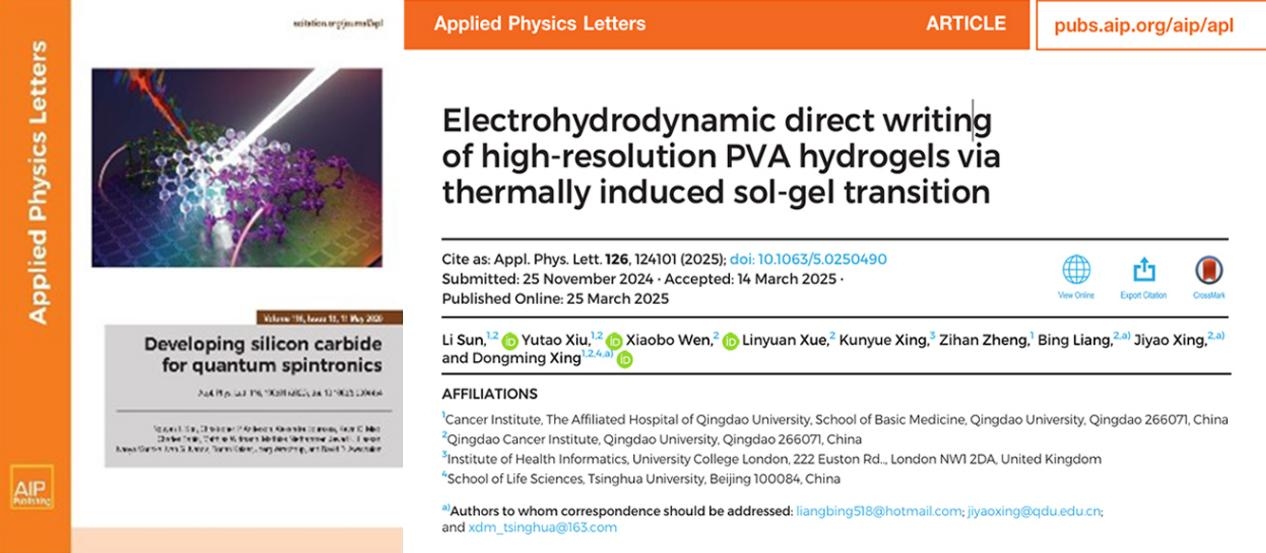 新聞網(wǎng)訊 近日,我校腫瘤院醫(yī)工創(chuàng)新中心邢東明團(tuán)隊(duì)在高分辨率生物材料打印領(lǐng)域取得階段性重要進(jìn)展,相關(guān)成果在《Applied Physics Letters》發(fā)表(自然指數(shù)期刊,DOI: 10.1063/5.0250490)。該期刊由美國物理聯(lián)合會(huì)出版,是具有全球影響力的權(quán)威學(xué)術(shù)期刊,聚焦應(yīng)用物理領(lǐng)域的最前沿重大發(fā)現(xiàn),快速傳播最新前沿研究動(dòng)態(tài)。論文第一作者為研究生孫歷,修玉濤、文曉博為共一作者,青島大學(xué)及青島大學(xué)附屬醫(yī)院為第一作者單位、第一通訊單位。
