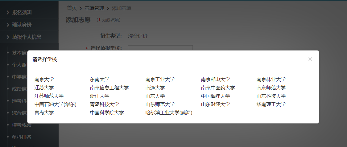 注冊成功后,請使用注冊的用戶名和密碼登錄“綜合評價報名系統”,請仔細閱讀“報名須知”,只填寫基本信息、個人照片、中學信息、成績信息(只填一科成績即可)、選考科目成績信息等系統必填項即可。