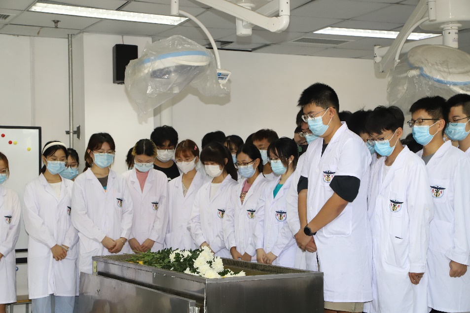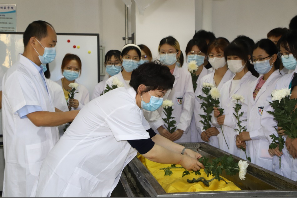 解剖學誓詞宣誓結(jié)束后,伴隨著肅穆的音樂,老師和同學們手捧黃白菊花,滿懷感恩與敬畏之心,莊重地向面前的這些“無語良師”們,敬獻鮮花,靜默悼念,以表達對他們深深的敬意和無盡的感恩。一束白色的花朵,一次由衷的鞠躬,詮釋著別樣的人間仁愛,寄托著偉大的師生恩情,全體人員靜默1分鐘。