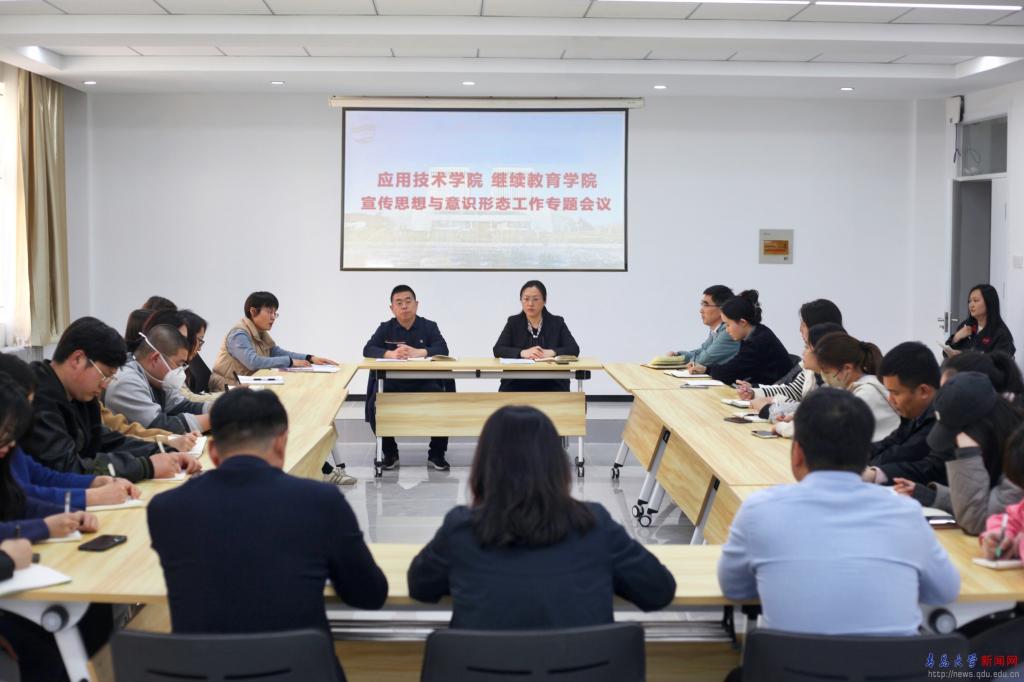 新聞網訊 為深入貫徹落實學校宣傳思想文化工作會議精神,進一步強化意識形態責任,實現高質量宣傳助推學院事業高質量發展,應用技術學院、繼續教育學院于4月23日下午在實驗樓203室組織召開宣傳思想與意識形態工作專題會議。學院黨委書記張燕出席并講話,副院長張敏主持會議。副院長初金濤及學院各部門負責人、宣傳信息員、各項目辦學單位負責人等參加會議。