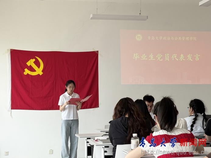 畢業生黨員代表董怡秀上臺發言,她分享了個人在大學期間的收獲與成長,表達了對黨組織培養的感恩之情,也代表全體畢業生黨員做出了牢記黨員使命、傳承政管精神,在實現中華民族偉大復興的征程中貢獻青春力量的堅定承諾。