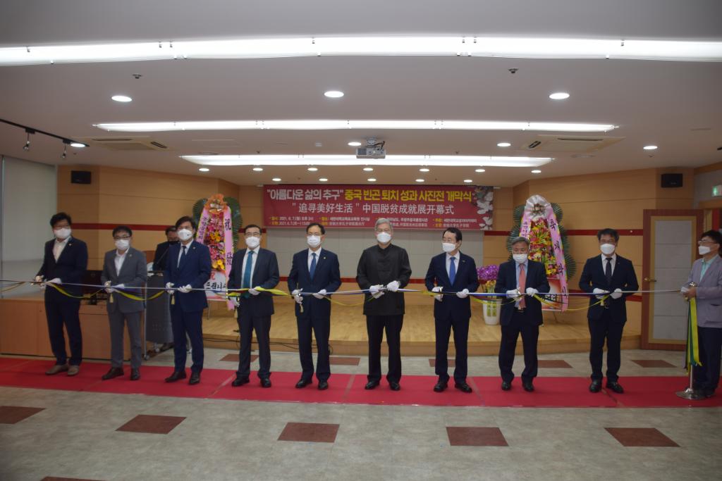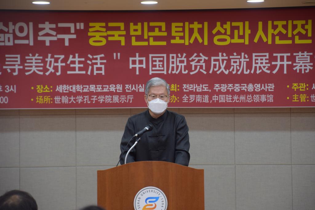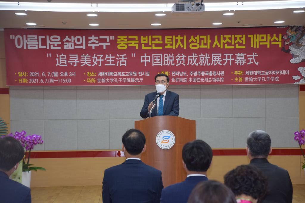 新聞網訊 6月7日,在韓國世翰大學孔子學院舉行“追尋美好生活”中國脫貧成就展開幕式。本次脫貧成就照片展由中國駐光州總領事館、全羅南道道廳共同主辦,由世翰大學孔子學院承辦。張承剛總領事、全羅南道政務副知事宋庠烙、木浦市長金鐘植、世翰大學總長李昇勛等全南地區政府機關和文化界、教育界、新聞媒體、華僑代表,留學生代表以及友好團體代表等50多位人士出席。