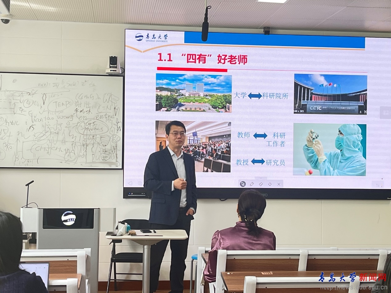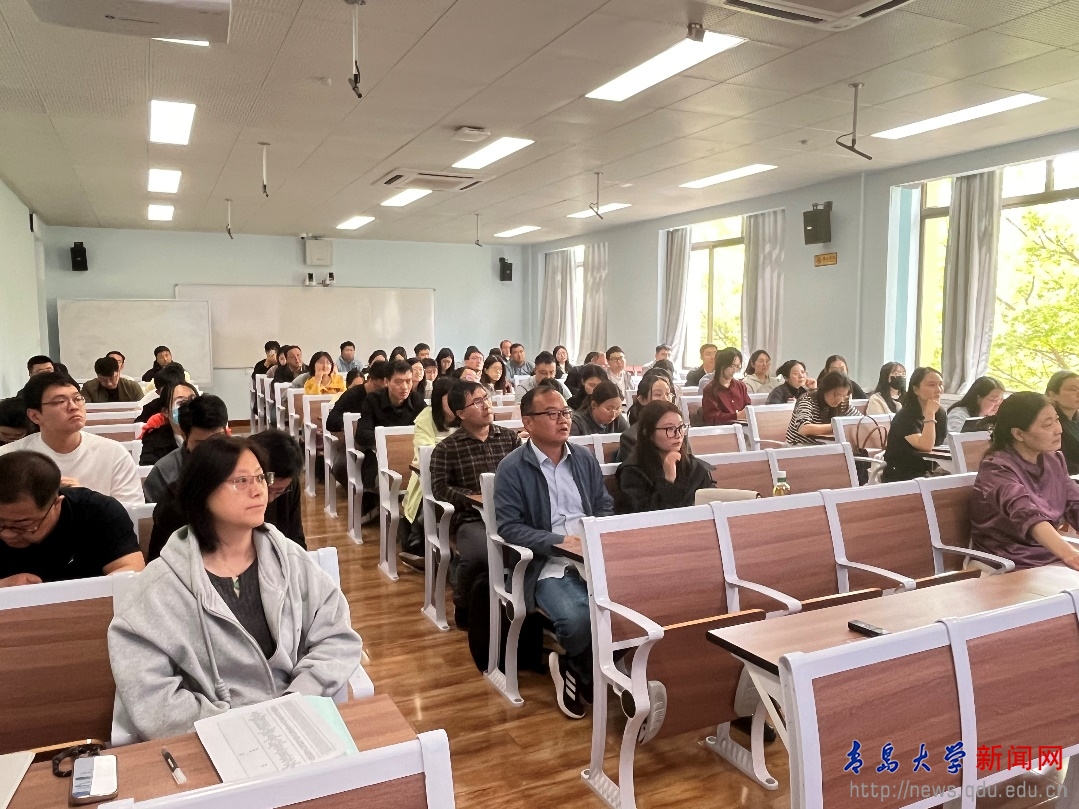 開班儀式結束后,教務處副處長耿慶匯做了題為“以本為本,潛心育人,爭做青大‘四有’好老師”的首場報告。他結合多年教學及管理經驗,從“樹立良好的教育教學理念”“熟知教學運行規章和制度”“堅守教師規范與規則底線”三個維度展開。他首先闡述了習近平總書記提出的“四有”好老師和“四個引路人”的重要內涵。隨后,他詳細介紹了OBE理念,并提出“AI時代教育理念變革”的問題,引發與會教師思考并討論。他從教學資格、關鍵教學文檔、課堂教學和考試管理四個方面解讀了我校本科教育教學的規章制度。最后,他從新時代高校教師職業行為十項準則入手,通過真實案例,引導大家要堅守教師規范,筑牢底線意識,預防教學事故。與會教師紛紛表示,培訓讓自己對學校的教學規范有了清晰的認識,對自己成為一名合格教師有重要的指導意義。